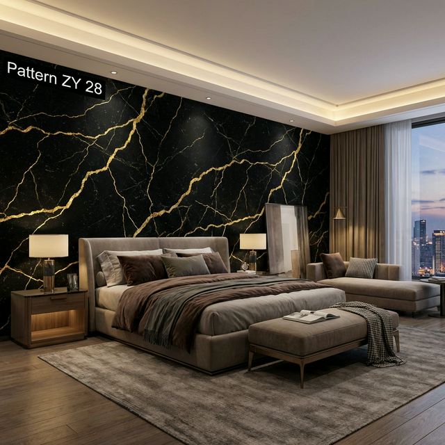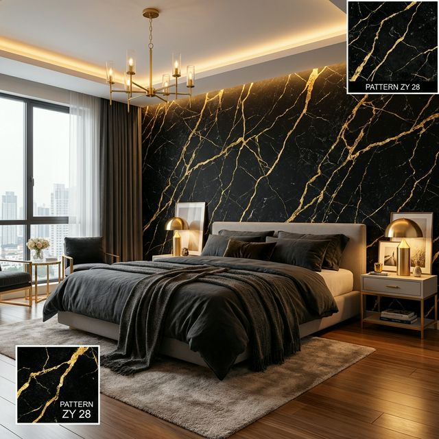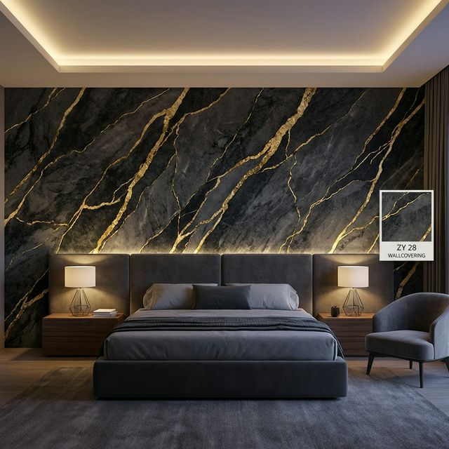 Wallpaper motif marmer hitam elegan dengan aksen urat emas yang mewah dan berkelas.