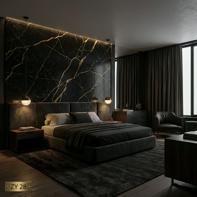 Kombinasi warna hitam glossy dengan garis emas menciptakan efek dramatis dan mahal tanpa perlu renovasi besar.